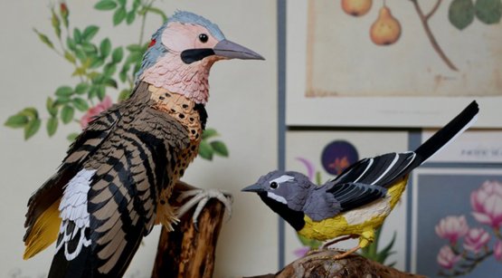 Mes sculptures naturalistes, principalement des oiseaux, sont inspirées par les Cabinets de curiosités, ces lieux d’exposition, de classification et de compilation de connaissances scientifiques. Mon travail s’inscrit dans une démarche de conservation et de mémoire, proche de la taxidermie mais dans laquelle la Nature est imitée au lieux d’être capturée. Chaque plume est découpée et ciselée à la main, un travail minutieux qui demande beaucoup de savoir faire et de nombreux jours de travail pour la réalisation d’un seul spécimen. En résultent des oeuvres uniques, précieuses et délicates, en opposition à la production de masse omniprésente. C’est une invitation à la lenteur, un hommage à la beauté et la fragilité des espèces qui nous entourent." Maeva